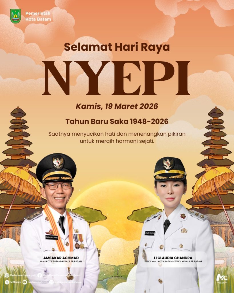 Newsnow.id, Batam – Wali Kota bersama Wakil Wali Kota Batam, Amsakar Achmad dan Li Claudia Chandra, mengajak masyarakat menjadikan Hari Raya Nyepi Tahun Baru Saka 1948 sebagai momentum untuk melakukan refleksi diri dan menemukan kedamaian batin.