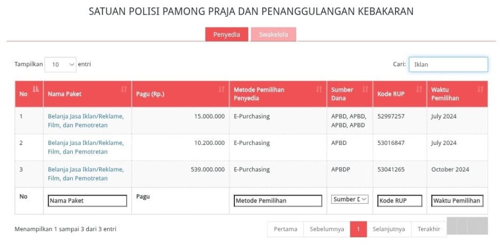 Penelusuran pada laman Sistem Informasi Rencana Umum Pengadaan (SiRUP) Lembaga Kebijakan Pengadaan Barang/Jasa Pemerintah (LKPP), anggaran Rp 539 juta pada OPD Satpol PP itu bersumber dari APBD Perubahan Tahun 2024 dengan nama paket “Belanja Jasa Iklan/Reklame, Film, dan Pemotretan”.