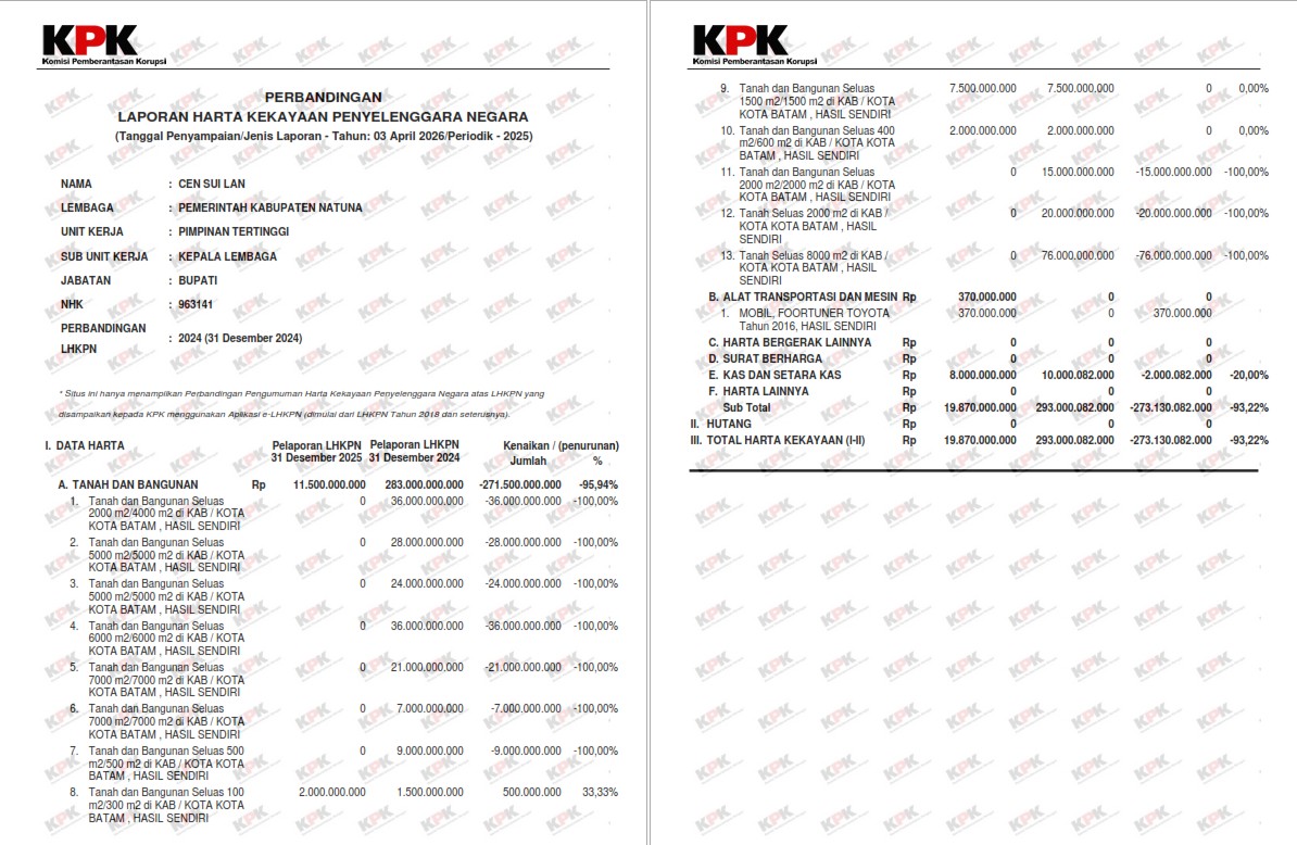 Perbandingan LHKPN Periode 2025 dan 2024 milik Bupati Natuna Cen Sui Lan. (F: e-LHKPN KPK)
